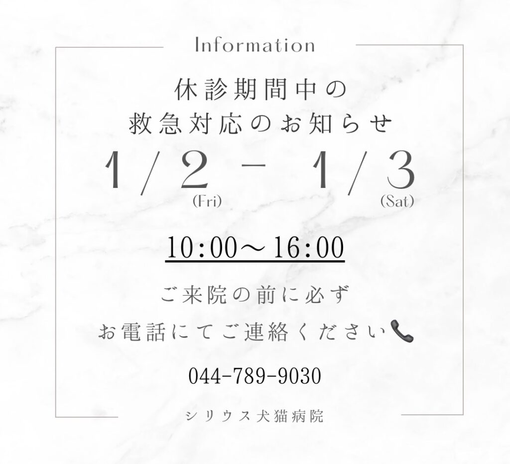 また、1/2~1/3のみ、休診期間ではありますが救急対応いたします。